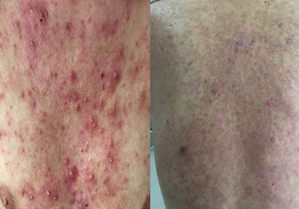 但直到2015年初,患者参军驻成都某部队服役,痤疮又开始爆发,患者讲,脓胞最大的时候,有小鸡蛋黄那么大,特别痛。没办法就到部队卫生队打消炎针,吊瓶,过几天就能消一点,过一段时间还长。那就在打针,如此反复。